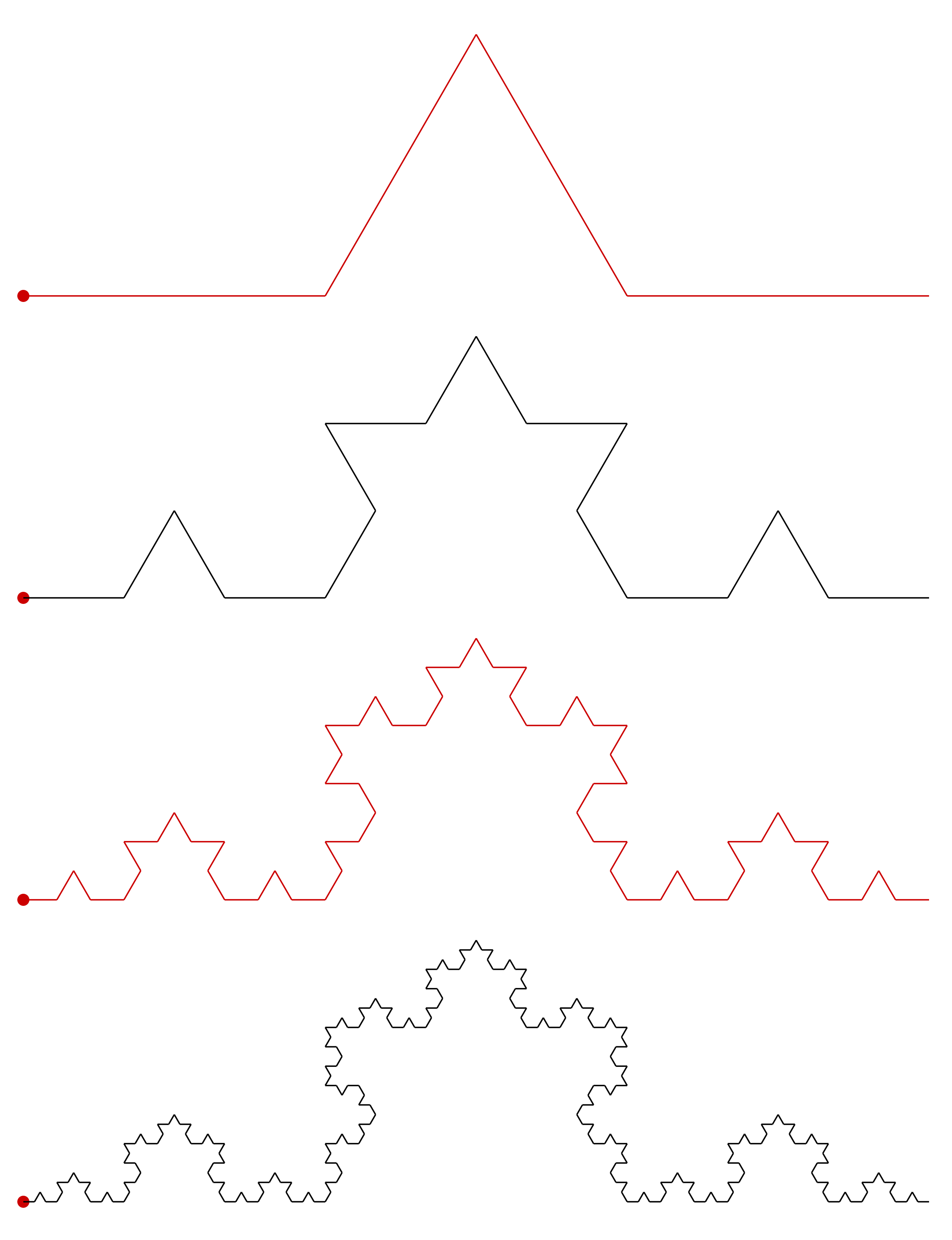 The classical way of creating a Koch snowflake is to begin with the four-segment path at the top, and then replace each of the four segments with a smaller copy of this path. Now replace each of the segments with an even smaller copy, and recurse until the copies are so small, no new detail is added.