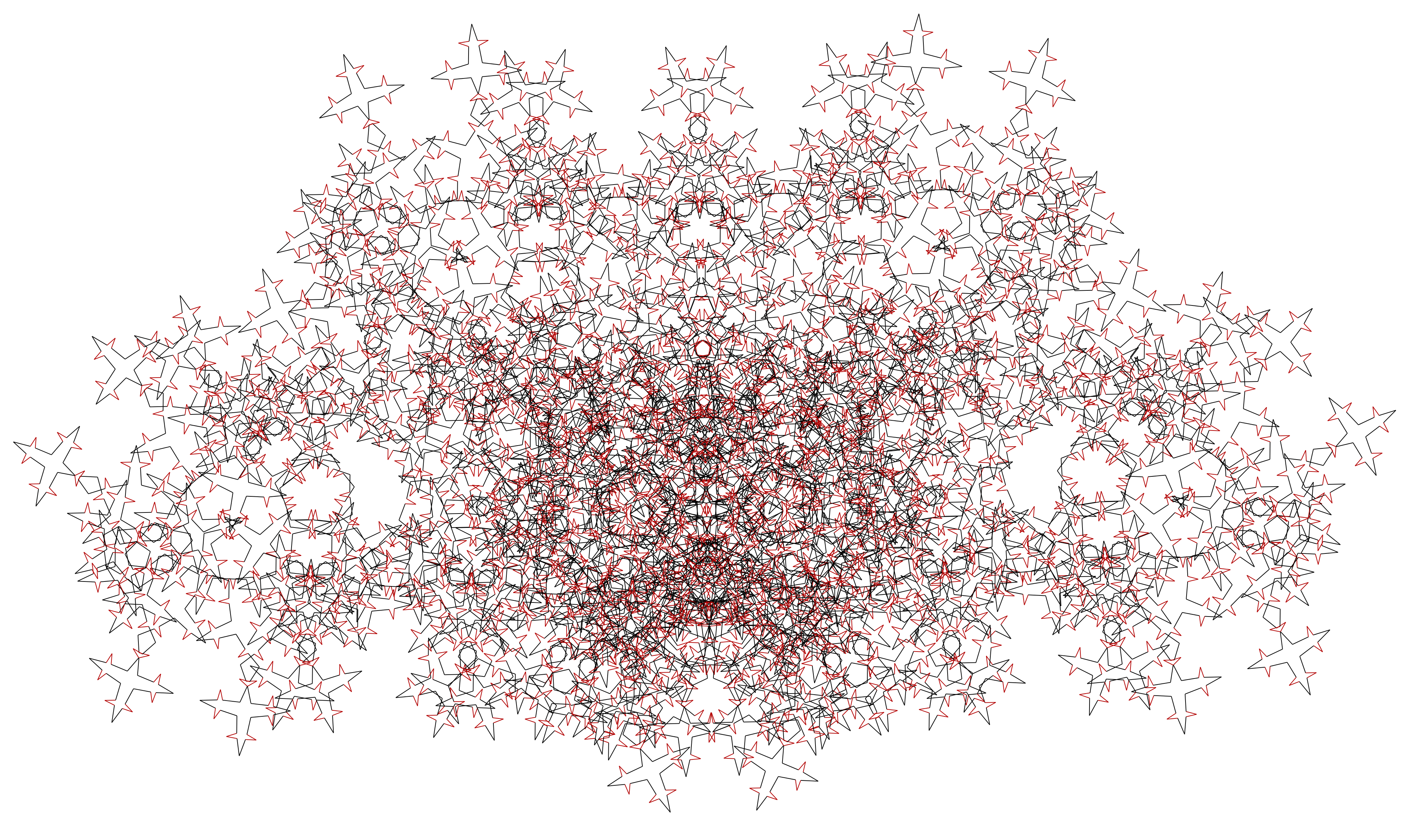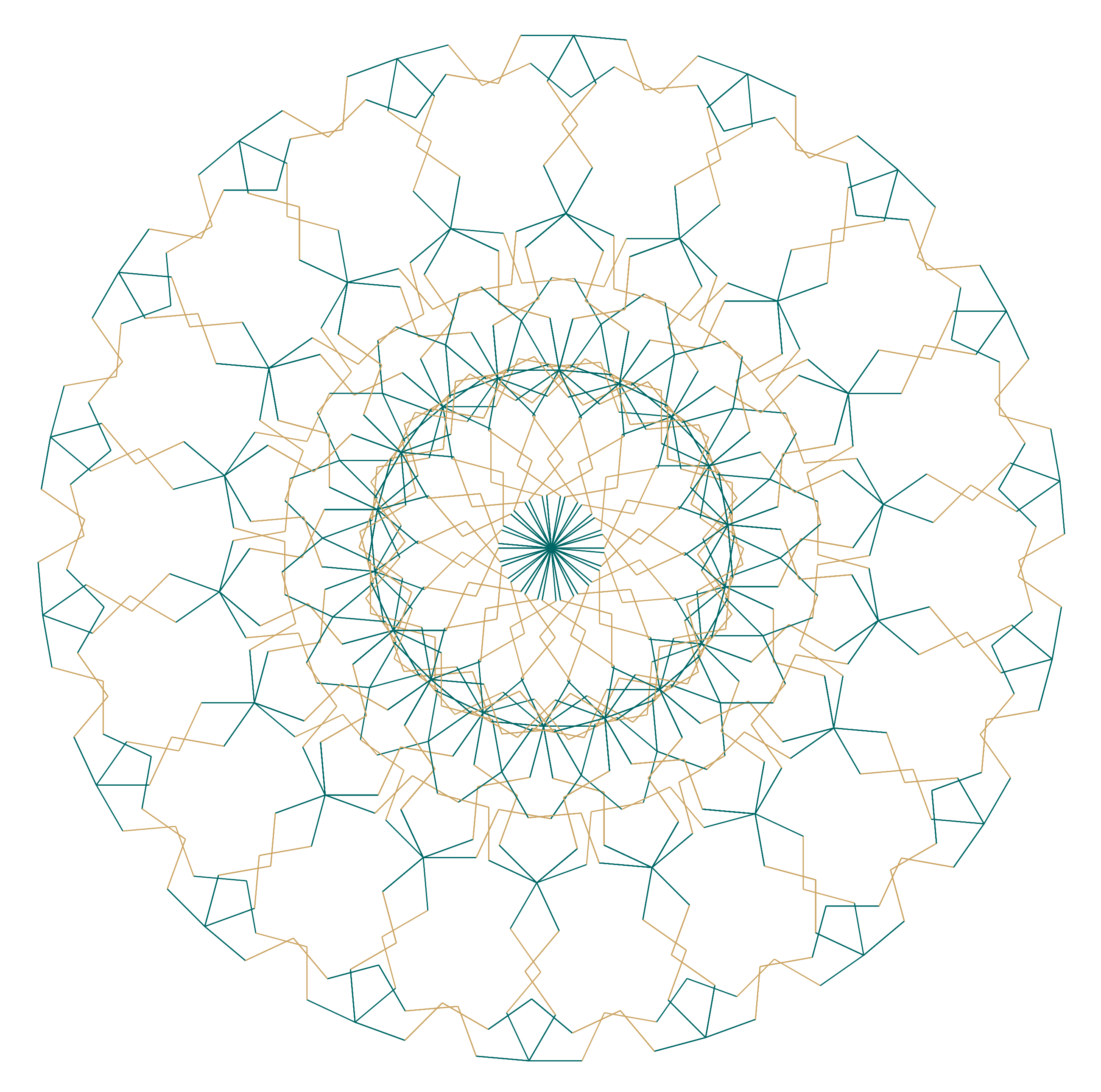 Another question Thomas posed was what would happen if the lengths of the segments weren’t all the same. This was a natural next step, and so I created an image using angles of +72 and -152 (staying relatively close to what I’d tried before), and using 1 and 0.618 for side lengths, since the pentagonal motifs suggested the golden ratio. Seven iterations produced the following remarkable image.