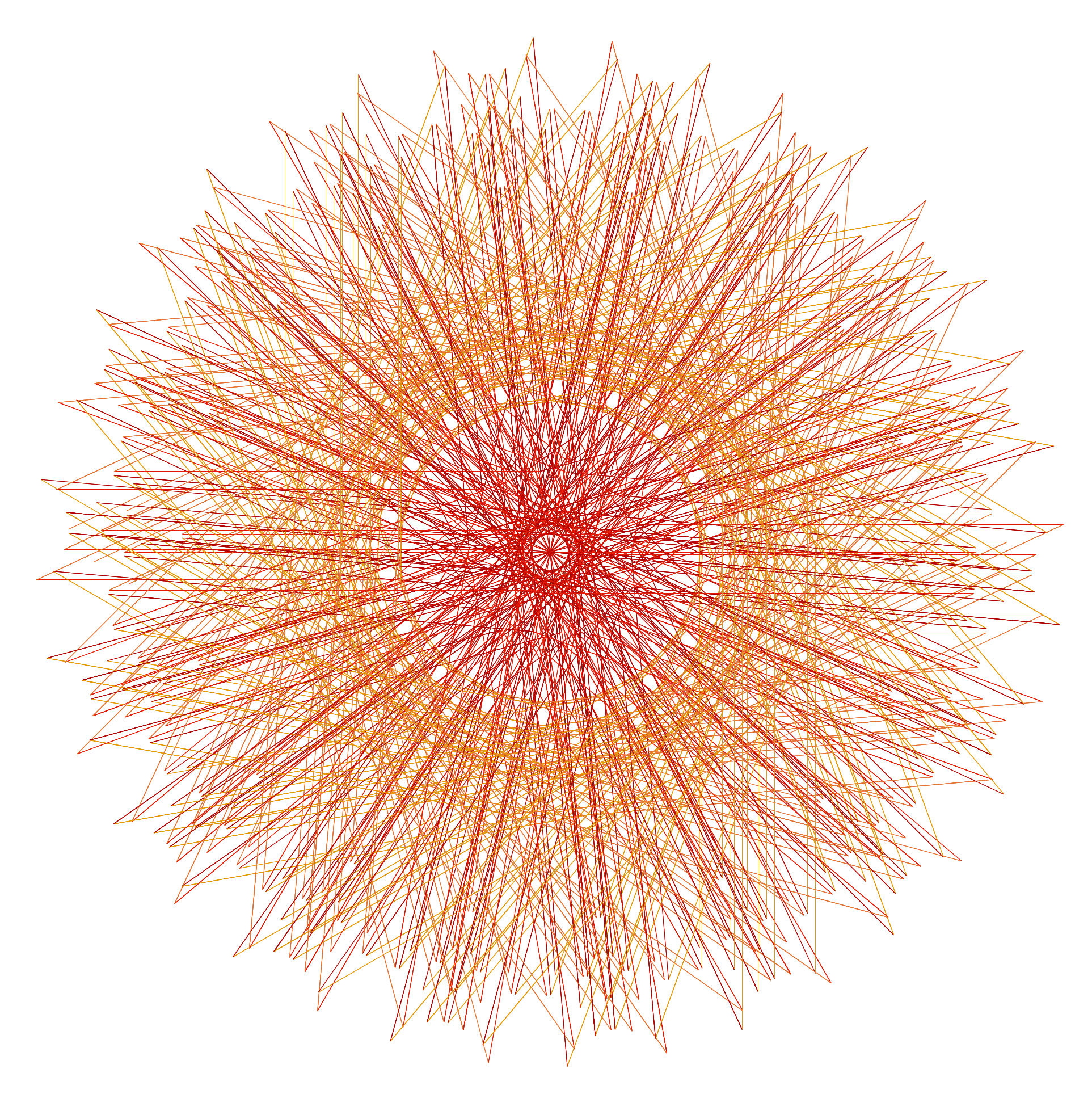 But that’s not the entire story — not every pair of angles which sum to 220 produces a star-like image. With 18 and 202, the curve doesn’t appear to close up — the following video clip shows the program running for about three minutes. As it runs longer and longer, more and more of the page is covered. Keep in mind this is not a random process — it’s the same process which produced the Koch snowflake, but with different starting parameters.