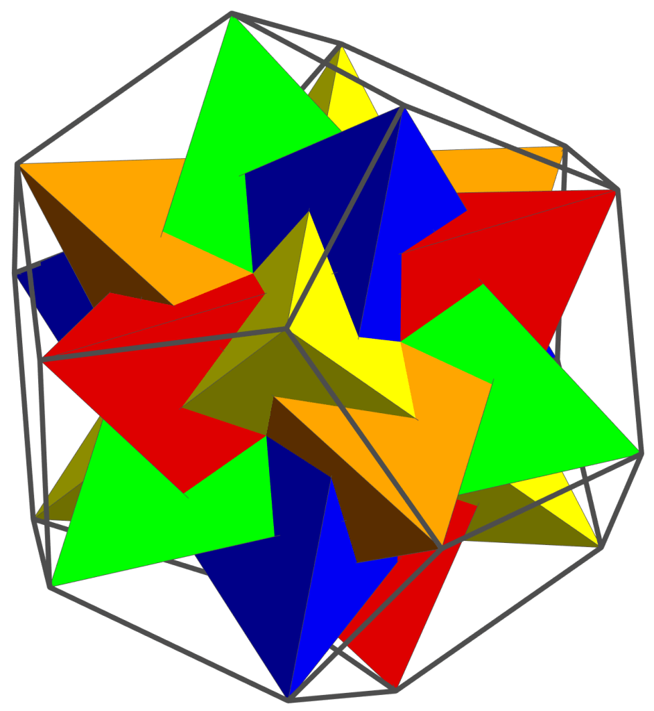 Another simple (but magic!) equation is 5 x 4 = 20. A tetrahedron has four vertices, while a dodecahedron has 20. It turns out that five tetrahedra may nicely be inscribed in a dodecahedron, as shown below. And the volume common to these five tetrahedra is an icosahedron.